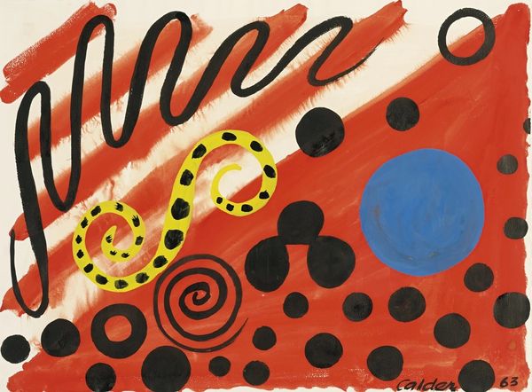 Painted in 1973 by Alexander Calder, Red Boomerangs and Blue Saucer is made with gouache on paper. It shows a whimsical composition rendered in bright, solid colors. Calder is best known for his innovative mobiles, suspended sculptures that move in response to air currents. This painting, while static, shares the same playful sensibility as his kinetic works. The gouache is applied in bold, flat areas, with a slightly uneven texture that reveals the artist's hand. The forms themselves are simple and abstract: curving lines, circles, and biomorphic shapes. The red and yellow create a vibrant contrast, while the small blue circle anchors the composition. While seemingly simple, Calder's paintings reflect a deep understanding of form and color. His background in engineering also informed his artistic practice, evident in the careful balance and construction of his compositions. This work challenges traditional hierarchies by embracing the accessibility of gouache, elevating it beyond its association with commercial art and into the realm of fine art.