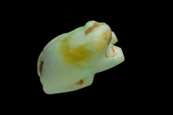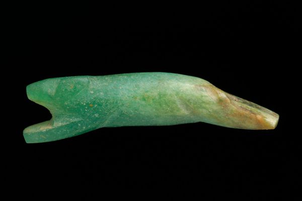 Curator: Here we have a "Bead in the Shape of a Crocodile," a captivating work crafted between 501 and 800, origins unknown, but now residing at the Minneapolis Institute of Art. Editor: My initial thought? Seafoam—but dangerous! It’s sleek yet still evokes something ancient and formidable, like it surfaced from a dream I once had, paddling along the Nile. Curator: Indeed. The cool, semi-translucent glass lends an ethereal quality to a creature usually associated with earthy environments. The form is rendered with sophisticated simplicity, emphasizing geometric abstraction. Editor: Abstraction softens its inherent danger, definitely. Instead of feeling threatened, I see it as an echo, a phantom limb of something once vitally alive and symbolic. Is it possible this tiny sculpture contained an entire cosmos of meaning back then? Curator: Quite likely. Crocodile imagery across numerous ancient cultures carries layered significance, evoking concepts of power, protection, and the potent forces of nature, rendered here in miniature. I'd also invite observers to reflect on the technical mastery needed to produce this level of intricate work using glass during that era. Editor: Oh, without question, to see it and actually hold it in your hand would only multiply your sense of marvel! All the alchemic magic transforming sand into symbolic totem, smoothed by time… that’s more powerful than any political decree. It shifts something fundamental in the soul, I feel. Curator: It embodies the fascinating paradox inherent in art—an object simultaneously of its moment yet speaking eloquently across vast temporal chasms. The transparency creates a perceptual layering; a constant shifting of figure-ground relationships dependent on ambient lighting. Editor: A trickster spirit trapped in delicate green, reminding us both of the beautiful surface of the waters, as well as the toothy realities lurking just below. I am almost compelled to believe that something small like this might genuinely alter the world’s future… through focused belief. Curator: So we see how the interplay of form and historical context allows for an array of diverse yet equally justifiable interpretations and appreciation of cultural legacy. Editor: Beautifully put. For me, it distills nature's beauty through a very human imagination—the kind that wrestles big ideas from even bigger silences. It proves objects—especially little talismanic ones— possess profound potency!