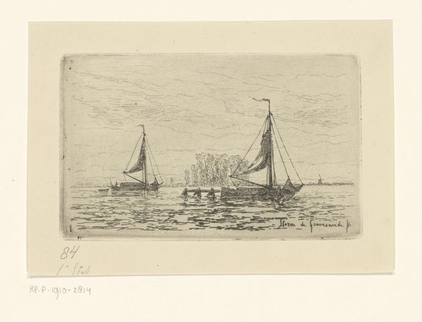 This is Egidius Linnig's etching of a fishing boat near the dunes of Blankenberge. Linnig, who died young, captured scenes that reflected the social and economic realities of his time. The scene depicts laborers on a modest fishing vessel, a stark contrast to the grand naval paintings often celebrated. During the 19th century, fishing was a hard life, and images like this offer a glimpse into the lives of working-class people who depended on the sea. The landscape is rendered with delicate lines, emphasizing the quiet, everyday nature of this maritime activity. Linnig avoids romanticizing the scene, instead presenting a straightforward depiction of labor and life. Consider how Linnig uses etching, a medium capable of both fine detail and broad tonal range, to draw attention to the boat, the men working, and the challenging environment they face. This piece invites reflection on the lives of those whose stories are often untold in grand historical narratives. It reminds us to consider the social fabric woven by ordinary people performing extraordinary labor.