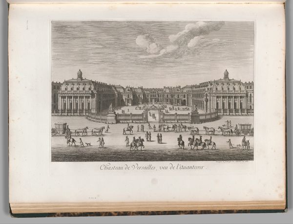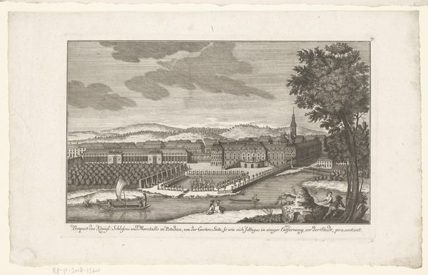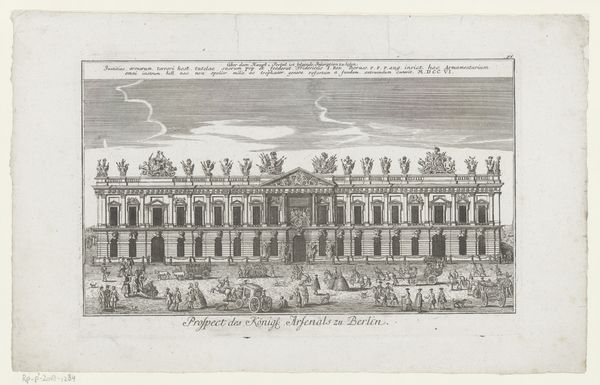 This print captures the Zeughaus and Kronprinzenpalais in Berlin through delicate lines etched by an anonymous artist. The buildings command our attention, structured by a relentless grid of windows and ornamentation. The print's composition creates a stage-like space where human figures are carefully placed, animating the scene while reinforcing the buildings' imposing scale. The linear precision highlights an era captivated by reason and order. Consider the formal arrangement; the buildings are not merely depicted but presented as embodiments of power. This visual emphasis aligns with broader cultural ideas, where architecture served as a tool for projecting authority. Notice how the clouds are shaped and defined by a series of tiny lines. The cloud shapes and how they contrast with the geometry of the buildings below add a dramatic flair, hinting at the sublime within the Age of Reason. This print is a testament to how lines can delineate structures and how a play of light and shadow evokes a particular historical narrative.