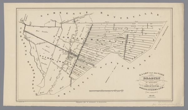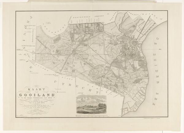 This is Jan van Jagen's "Kaart van de Vijfheerenlanden, bestaande uit twee delen", created in the 18th century. The map's organization in two distinct parts immediately grabs attention; it compels us to consider the relationship between these halves and how they constitute a unified representation. The cool, muted tones and precise lines establish a calm, measured view of the region. Notice how the arrangement of fields, waterways, and settlements is rendered through a network of lines, giving the landscape a structured, almost geometric quality. The composition invites us to consider the underlying systems of organization and control inherent in mapping. The cartographic representation isn't just about geographical accuracy, it also reflects a particular way of seeing and ordering the world. The map invites a semiotic reading, with each line, symbol, and label functioning as a sign that points to broader cultural and historical meanings. This formal structure reveals the intellectual frameworks through which space, property, and power were understood in the 18th century.