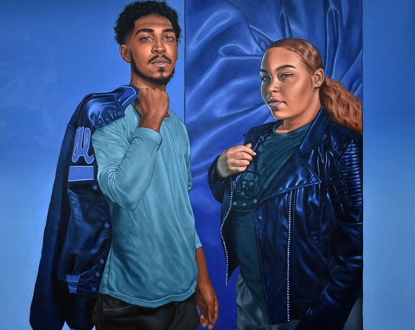 Monica Ikegwu’s "Wass good dummy" is a painting that dives headfirst into a sea of blue, creating a world where color and subject blend. The mark-making here is so smooth and deliberate. Ikegwu works with thin layers of paint. It's like she's gently coaxing the image into existence, rather than wrestling it onto the canvas. Look closely at the background, this pattern, a kind of blue echo, like wallpaper, but slightly off, slightly hypnotic. The blue of the puffer jacket is so tactile you want to reach out and feel that synthetic smoothness. The blues are not just blues; they are moods, temperatures, attitudes. This painting feels like a conversation with someone like Barkley L. Hendricks, who captured his subjects with such cool precision and unflinching gaze. Just as Hendricks, Ikegwu sees the world through a contemporary lens. The title is playful and enigmatic, creating a space for multiple readings. It makes you think about the nature of representation and the dialogue between the artist, the subject, and us.