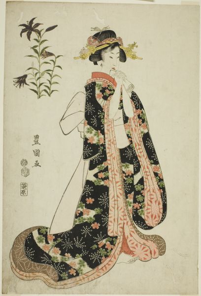 Curator: Welcome. We're standing before a Japanese woodblock print by Yashima Gakutei. The artwork, titled "Liu Haichan (Gamma), from the series "Lives of Taoist Immortals Parodied by Courtesans – A Series of Seven (Keisei mitate ressenden, nanaban no uchi)" dates from about 1821-1822. Editor: My immediate impression is one of subtle melancholy. The pale background contrasts beautifully with the figure's patterned robes, yet the downward gaze lends an air of introspection, even sorrow. The limited palette adds to the muted emotional register. Curator: Indeed. The figure is a courtesan portrayed in the guise of Liu Haichan, a Taoist immortal known for his detachment from worldly desires and association with wealth, represented by the string of coins he discovered. Here, she is occupied with a small object, obscuring this traditional iconography. Editor: So, Gakutei is playing with these layers of meaning, this visual code if you will. The figure's posture forms a dynamic interplay with the surrounding space—creating a triangular shape, emphasizing her controlled stillness. The patterning of her kimono creates intricate divisions. The composition overall seems highly structured and considered. Curator: Exactly. The image creates tension between expectation and reality. The parody invites a dialogue between sacred and profane, hinting perhaps, at the fleeting nature of beauty and pleasure within the floating world—Ukiyo-e. The symbols of immortality contrast starkly with her earthly profession. Editor: The materiality of the print itself speaks volumes. The delicate application of color suggests restraint—though the impression gives an intimate, textural experience through subtle gradations of tone. It also gives the viewer an appreciation for the skill and precision required to execute such a complex composition through the medium of woodblock printing. Curator: Thinking about cultural memory here, such images served as witty commentary for a sophisticated urban audience. They knew the stories and jokes, finding pleasure in their reflection, using images like mirrors or keys. Editor: A mirror, indeed, that shows us a glimpse into the complex dance of identity and representation that still fascinates us today. A very clever fusion of form and layered meaning. Curator: A provocative dance across the threshold of centuries, prompting continued dialogue between viewer and artwork, don't you agree? Editor: Absolutely, and one we’re delighted to explore more deeply with you in further stops.