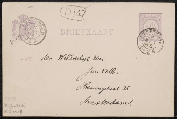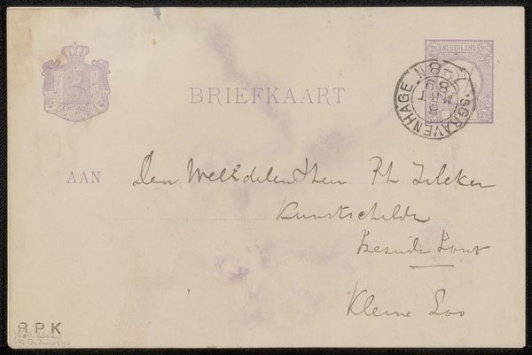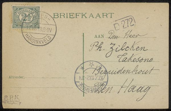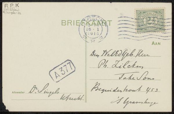 This is a postcard to Philip Zilcken by Cornelia van der Hart, with the stamp dated 1915. The postcard, with its muted palette of whites and blues, presents a fascinating study in information architecture, before the digital age. Note how the text is organized into distinct zones, each demarcated by its function: address, message, postal markings. The eye is drawn to the upper right where the stamp with ‘Nederland’ declares its origin, secured in place by wavy cancellation lines. The circular date stamp disrupts the linear flow, acting as a temporal anchor. The handwritten script offers a personal counterpoint to the printed 'BRIEFKAART', hinting at the intimate exchange between sender and receiver. The composition is a play between order and entropy, a tension mirrored in structuralist theory where underlying systems meet individual expression. The postcard becomes a canvas where language, bureaucracy, and personal intent collide, revealing the complex semiotics of early 20th-century communication.