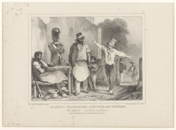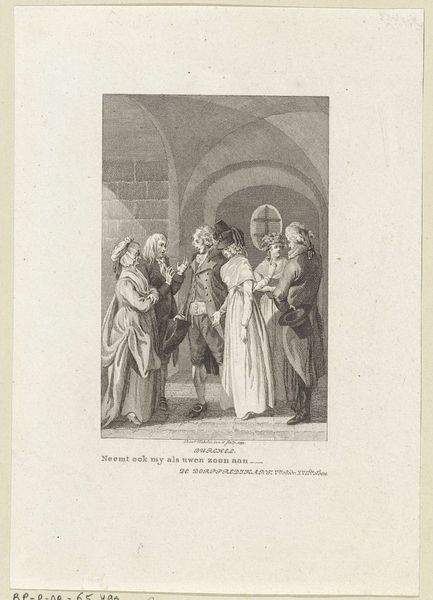 Curator: This print, attributed to the British School, presents a scene with figures in what appears to be a narrative moment, though the precise title is unknown. It's part of the Tate's collection. Editor: There's a distinct mood here – almost theatrical. The lighting is dramatic, and the figures seem posed. I'm drawn to the costuming; it reads as Orientalist fantasy. Curator: Indeed. Considering the period when this print was likely made, the Orientalist aesthetic was quite popular, influencing literature, theater, and the visual arts. The print likely speaks to larger socio-political contexts of British imperialism. Editor: Right, it's not just aesthetic; it's a representation of power dynamics. I wonder about the figures themselves. Who are they meant to be, and what narratives are being perpetuated through their depiction? Curator: These were common questions among many British intellectuals then. And this print, perhaps unwittingly, contributes to the dialogue. It's an interesting piece for considering the visual culture surrounding empire. Editor: Exactly, and it highlights how art can reflect, and sometimes reinforce, problematic perspectives.