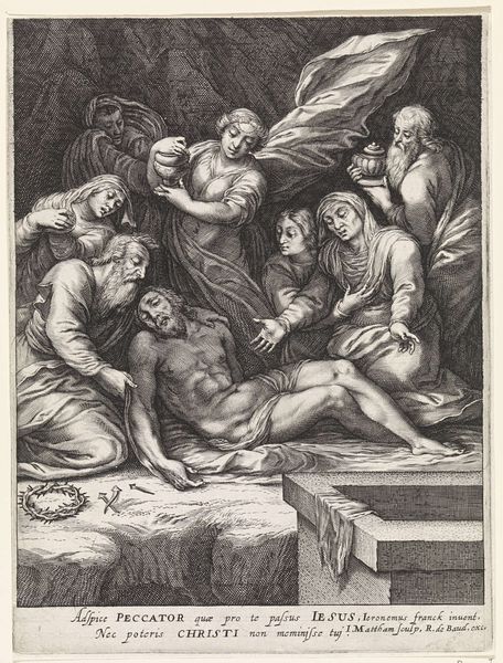 Cornelis Visscher created this print of “The Lamentation” in the mid-17th century, and its somber tones and intricate lines immediately evoke a sense of profound sorrow and solemnity. The composition, with its careful arrangement of figures around the lifeless body of Christ, invites us to contemplate themes of death, grief, and human compassion. Visscher masterfully uses the etching technique to play with light and shadow, creating a dramatic chiaroscuro effect that heightens the emotional intensity of the scene. The precise rendering of textures, from the soft drapery to the smooth skin, showcases his technical skill and attention to detail. We can view this as a semiotic system, where the signs create meaning: the body of Christ as a symbol of sacrifice, the weeping women as embodiments of grief, and the dark background as a metaphor for despair. Ultimately, Visscher's "Lamentation" is more than just a depiction of a biblical scene, it is a meditation on the human condition and the universal experience of mourning. It reminds us that art is not just about representation, but also about interpretation and the ongoing dialogue between the artist, the artwork, and the viewer.