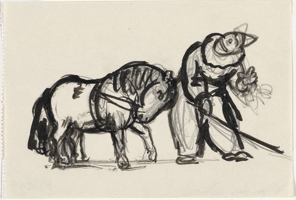 Editor: Here we have Gerrit Willem Dijsselhof’s “Study of Two Horses for a Cart in Paris,” likely done between 1876 and 1924. It's a pencil drawing, and what strikes me most is its immediacy – like a snapshot from a sketchbook. What do you see in this piece? Curator: The sketch, you see, isn't just about the physical representation of horses. It's about the symbolic weight they carried. Horses in 19th-century Paris weren't merely beasts of burden; they represented progress, the engine of a rapidly modernizing city. What feelings does the sketch evoke in you? Editor: Definitely a sense of everyday life, the hustle of a city, maybe a bit of weariness in the horses themselves. It seems almost… melancholic, despite being a simple sketch. Curator: Precisely. Consider the recurring motif of the working animal throughout history. They signify labor, sacrifice, even subjugation. And the sketch’s incompleteness, its raw quality, amplifies this. Dijsselhof captures not just the horse, but its cultural echo, its place in the grand narrative. Do you see a cultural context in the lines? Editor: I think so. It’s like he's hinting at the unseen stories of labor and urbanization that these horses were a part of. It makes me wonder about the stories Dijsselhof wanted to tell. Curator: Indeed! The unfinished quality almost invites us to fill in those narratives, to project our own understanding of that era onto the image. In that way the symbols speak, creating not just an image of reality but also the social, cultural and psychological meaning imbued to them. What will you take away? Editor: This has totally shifted my perception of sketches. Now I’m wondering what symbols are lurking beneath the surface!