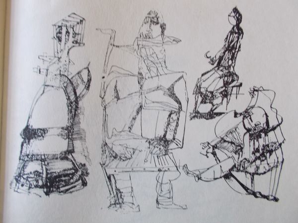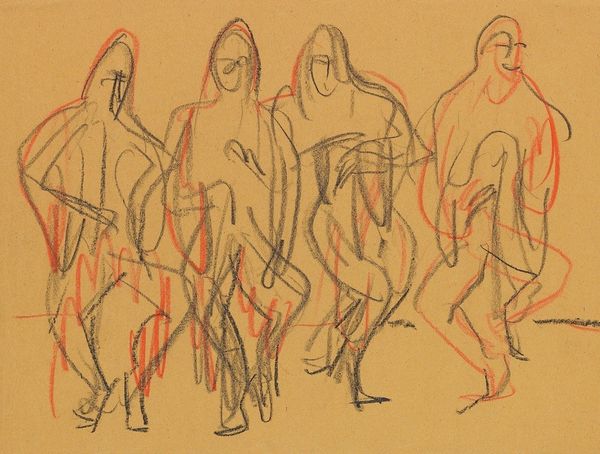 Curator: Here we have Ferdinand Hodler’s “Five Swearing,” created around 1912. Editor: What strikes me immediately is its raw, expressive energy. The loose lines, the figures all raising their hands—it’s visually arresting, conveying a strong sense of urgency, a sort of chaotic solemnity. Curator: Absolutely. The political context is vital here. Hodler, though Swiss, was deeply concerned with the escalating tensions in Europe leading up to World War I. His art increasingly reflected this pre-war anxiety and growing sense of social turmoil. "Five Swearing" seems a direct response to such concerns. Editor: I see that—it looks expressionistic in a way. You can feel his hand moving quickly on the paper to make those lines. Note how he uses only line; a few shades emerge only due to overlapping line weight—like how a draftsman marks perspective through volume and placement alone. Curator: Precisely, it echoes the artistic and political circles grappling with new modes of thinking about representation, about national identity. And note the deliberate lack of specific detail. It's not about individual identity; it is about collective action. The lack of individuation can make them be understood as symbolic representatives, as more people swear a vow than merely five. Editor: That works with my feeling about raw and the quick gestural method that Hodler utilized. So, it isn't portraiture—it is a political idea sketched out with very effective economy, just through basic composition. The bodies, the upraised arms--all so linear! Curator: It underscores Hodler’s awareness of the growing need for unity against what he, and many others, perceived as an impending catastrophe. His stance against encroaching military and political ideologies is really on display here. Editor: It's impressive how a few simple lines capture such a profound historical moment. The eye can't help but bounce across the lines until a final read--but only because Hodler placed these very clear gestures in very strategic ways. There is quite some care involved. Curator: It truly encapsulates an era teetering on the brink, as viewed through the lens of individual reaction and collective yearning for stability. It helps, for me at least, ground and comprehend art of this period, while so much was shifting beneath artists' feet. Editor: Indeed. This drawing—so economical, quick, and yet so suggestive of volume and shape in just some basic angles, shades, and gestures—definitely serves as a potent example of how potent visual language can be on its own.