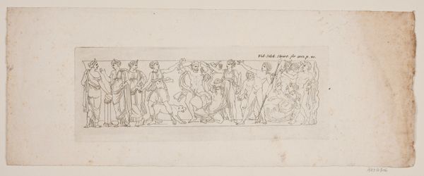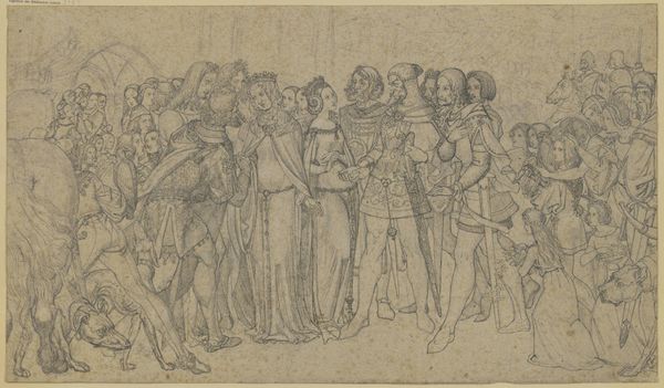 Editor: Here we have Franz Pforr's "The Reconciliation of Emperor Otto the Great with his Brother Henry," rendered in ink. The lines are so delicate, almost hesitant. It evokes a very staged, ceremonial atmosphere. How would you approach analyzing this work? Curator: From a materialist perspective, the drawing itself, its very existence, signals a claim. Look at the labor involved in producing such a detailed work. It wasn't just about skill, but time and resources – who commissioned it, and why prioritize this specific historical narrative? Editor: So, you're focusing on the production process? The economic and social implications of creating something like this? Curator: Exactly. Consider the type of ink used, the quality of the paper. Was this preparatory work or an end in itself? What was the intended audience? Each element hints at the social relationships and the value system that elevated history painting and figuration in that period. Editor: I see what you mean. It’s not just about the scene depicted, but who had the means to commission and create such a record. Were there workshops, apprentices involved in churning out similar works, transforming history into commodities? Curator: Precisely. The labor aspect reveals so much. Were these materials readily available? Were certain pigments more costly than others? Those decisions shaped the image we see, embodying societal preferences and limitations. Editor: So, thinking about it as an object tied to specific production methods changes how we interpret its narrative meaning too. It's not just history; it's a constructed, consumed product of its time. Curator: Absolutely. Analyzing the drawing through the lens of its material production offers insights into how historical events were curated, consumed, and imbued with symbolic power in Pforr's world. Editor: That's fascinating! It reframes my perspective entirely, shifting focus from just 'who' and 'what' to the 'how' and 'why' of its material existence. Curator: Indeed. By looking at the material, we're uncovering hidden stories about the artist’s context, the commissioner's intent, and the viewer's consumption of history.