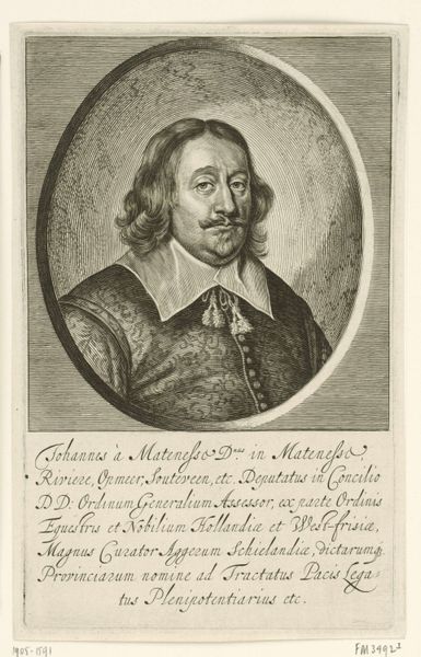 This portrait of Admiral Michiel Adriaensz de Ruyter was created by Pieter de Jode the Younger using engraving. This is an intaglio printmaking technique, where the design is incised into a metal plate, and then filled with ink. The plate is pressed to paper, resulting in a raised image. Consider the labor involved; the steady hand required to cut those delicate lines, to build up tone and texture. The cross-hatching that defines de Ruyter’s face and clothing, the intricate details of the naval battle raging behind him, all speak to the engraver's skill. This wasn't just about reproducing an image, it was about transforming it. Engraving was a key technology in the rise of mass media. It allowed for the relatively quick reproduction of images, spreading ideas and information rapidly. Here, it serves to immortalize a powerful figure. It connects artistic skill, technological advancement, and the social and political context of the Dutch Golden Age.