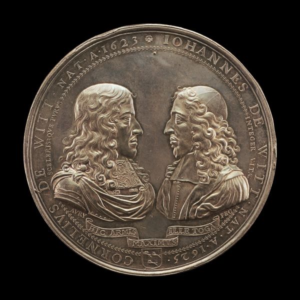 Curator: Here we have "Moord op de gebroeders De Witt," dating back to 1672, crafted by Pierre Aury. The piece is a relief engraving on metal. Editor: Immediately, it feels severe and formal. The monochrome material creates a stark representation of power, or rather, of lives taken. Curator: The artwork depicts the De Witt brothers. Can you expand on that assessment considering the tumultuous sociopolitical context of the period? Editor: Certainly. Consider the Baroque era, ripe with opulent displays of authority, but also fraught with political instability. The use of metal speaks to durability and commemoration. Metalworking at the time required specialized labor, and reflected class structures through the commissioned production. Who funded it is worth further examination. Curator: Indeed. The piece engages themes of martyrdom and justice, fitting within a long history of works that grapple with political violence and trauma. Thinking about today, the rise of polarizing political rhetoric has made the past feel suddenly very present again. Editor: Right. The labor behind this object also becomes part of that broader political landscape. These portraits immortalize figures caught in a cycle of violence, raising critical questions about how we engage with divisive narratives. Curator: It prompts us to examine the function of commemorative objects in society. Who are we remembering, and what specific stories do we memorialize and thereby validate? Editor: Absolutely. The materials here become integral to the message – the deliberate choice to fashion such a graphic moment in metal forces us to consider what labor, skill, and materials get deemed valuable. It brings us back to who and how are stories being manufactured. Curator: Reflecting on it, the object is successful in stirring difficult feelings and complex discussions on political upheaval and injustice that remain pertinent. Editor: For me, it drives home the point of who decides history, and which acts get set in stone or, in this case, metal.