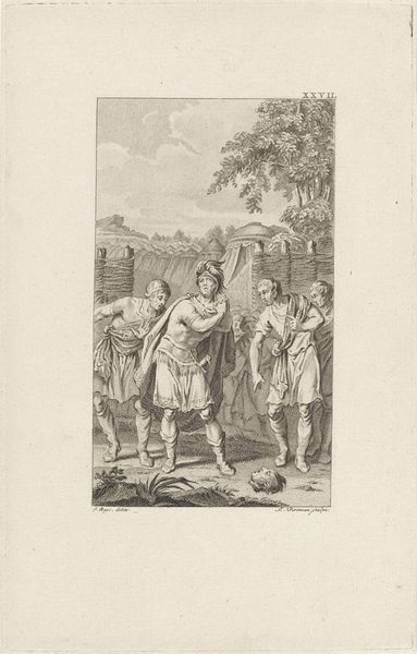 Ludwig Gottlieb Portman made this engraving, Titus Manlius Torquatus laat zijn zoon onthoofden, using metal plates and paper. Engraving is a printmaking technique that relies on skilled labor and specialized tools. The artist carefully incises an image into a metal plate, often copper, using a tool called a burin. This requires immense precision and control, as the depth and width of the lines determine the darkness and intensity of the printed image. Ink is then applied to the plate, filling the engraved lines, and the surface is wiped clean. Finally, the image is transferred to paper under high pressure, resulting in a print with crisp lines and fine details. The linear quality visible in the artwork underscores the labor-intensive process of engraving. The stark contrast and precise lines create a sense of drama and moral weight, reflecting the story's theme of civic duty. By considering the materials and processes involved in its creation, we can appreciate the work as not only a narrative scene but also a testament to human skill and artistry.