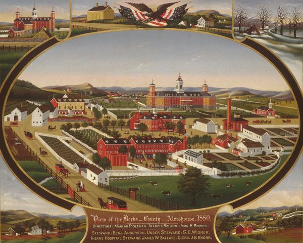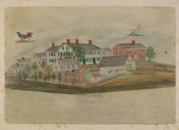 Editor: Here we have Joseph Hidley's "View of Poestenkill, New York," painted sometime between 1867 and 1870. What strikes me most is the incredible detail, like a bird's-eye view, but one rendered with such care. What do you see in this piece, from your perspective? Curator: Well, for me, this isn't just a landscape; it’s almost a portrait of a place frozen in time. It reminds me of those antique maps that weren't just about geography, but about celebrating the spirit of a community. Look at the way Hidley emphasizes the church steeple and the neat rows of houses, little proud emblems of civilization nestled in the hills. Makes you wonder what life was *really* like there, doesn’t it? Did those horses kicking up dust dream of bigger cities? Editor: I suppose so! It’s quite idealized, though, don’t you think? It feels very neat and orderly. Curator: Absolutely! It’s less about stark realism and more about Hidley’s feeling towards the town, or perhaps what his patron wanted to see. It’s like he’s saying, "Here's a town full of potential, industry, and moral uprightness!" What if, instead of painting the scene, he started writing a ballad of Poestenkill instead? Same sentiment, different rhythm. Editor: That’s an interesting way to put it. I never really considered the almost… propaganda aspect. It makes you question the reality of it all. Curator: Precisely! Art whispers stories – some true, some embellished. Maybe that’s the real beauty: the questions it stirs. What untold tales do you suppose each house hides? Editor: Definitely given me a lot to consider. Thanks for offering some great thoughts!