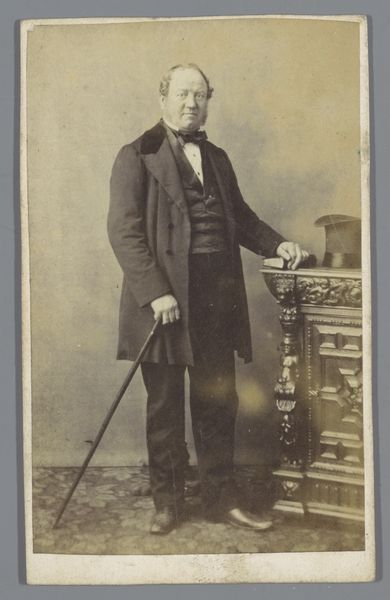Editor: This is a rather intriguing portrait titled "Portret van een onbekende man met hoge hoed" by H.R. Williams, created sometime between 1855 and 1885. It’s an albumen print, which gives it a warm, sepia tone. There is something so proper and stoic about it, though I'm drawn to it nonetheless. What strikes you most about it? Curator: The albumen print itself is key. Understanding the laborious process—coating paper with egg whites, sensitizing it, exposing the negative, and then meticulously toning and fixing—reveals a great deal about the value placed on portraiture at this time. Consider the expense and time invested compared to other forms of image making. The choice to present it this way suggests a careful attempt to emulate the traditions and connotations of painted portraits, a direct comparison that speaks to the anxieties of new technologies displacing old methods and material value. How do you read the presentation of his clothing and accessories? Editor: Well, his clothing definitely indicates a certain level of status, and holding his top hat like that must mean something, doesn’t it? It seems intentionally performative. Curator: Exactly. His carefully chosen attire – the cut of the coat, the elaborate waistcoat, even the watch chain – it’s all carefully constructed and chosen in relation to mass manufacturing and consumption. This is about a certain kind of persona: someone who embodies bourgeois respectability. What labor went into the production of those textiles? The chair as well. Everything here is a designed object intended for sale. Considering this material context complicates our view, wouldn’t you say? Editor: I never really thought about photography that way – as an industry that relied on so many other industries for its materials. It makes you see the image in a new way. Thanks! Curator: Indeed! It reframes our understanding of the sitter himself. Seeing through a materialist lens allows us to read beyond the surface, uncovering layers of social and economic meaning embedded within this seemingly simple portrait.