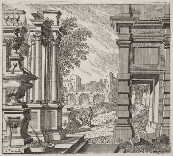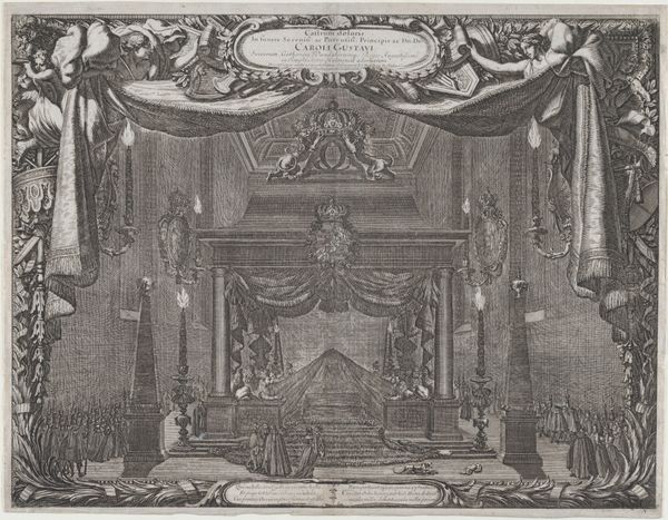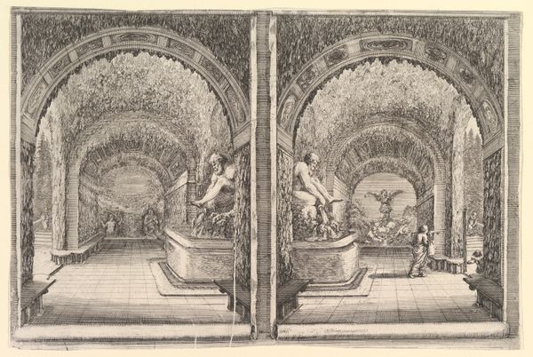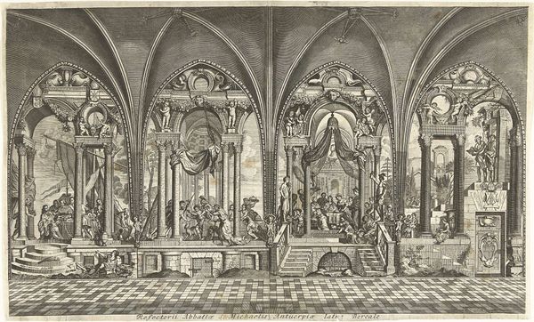 Giovanni Battista Falda created this print titled "Theater in Saint Peter's Basilica for the Canonization of Gaetano Thiene and Francis Borgia on April 12, 1671". The composition is dominated by an architectural rendering of the interior of Saint Peter's, teeming with figures that animate the religious ceremony. Falda masterfully employs linear perspective to emphasize the cavernous space, drawing the viewer's eye toward the high altar. The rigorous lines of the basilica's structure are softened by the curves of the arches and domes, creating a dynamic interplay between geometry and fluidity. The texture is rich, achieved through intricate cross-hatching that gives depth to the stone and fabric. This suggests the opulence of the Catholic Church and also mirrors the theatricality of the canonization event itself. Here, the architecture symbolizes the enduring power of the Church while the ephemeral theater represents the performative aspects of religious spectacle. This print does not just capture an event; it stages a discourse on power, faith, and representation.