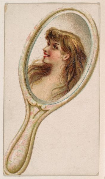 This is a novelty print of a mirror, part of a series by Kinney Bros. Tobacco Company. The mirror, an object of vanity and self-reflection, frames the image of a beautiful woman. Mirrors have long held symbolic weight. In classical antiquity, Narcissus met his end when gazing at his own reflection. This tale echoes through the ages, reappearing in Renaissance paintings and modern literature as a cautionary symbol against excessive self-love. And yet, the mirror is also an instrument of truth, revealing what is unseen. The gaze of the woman, directed towards her own image, provokes contemplation on the nature of identity and representation. Is this a true reflection, or a romanticized ideal crafted by the artist? Perhaps the mirror is a symbol of human desire, forever seeking an idealized version of ourselves. This search plays out again and again in the theater of life, revealing the emotional tension between what we are and what we long to be.