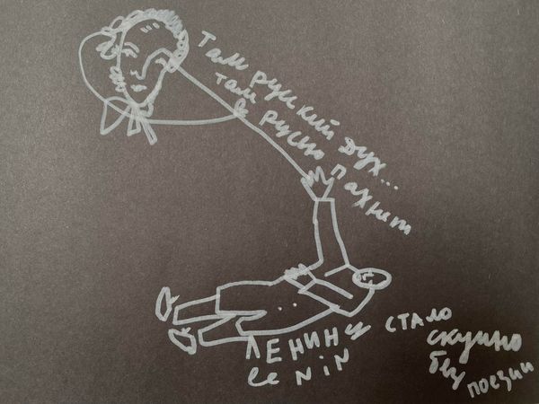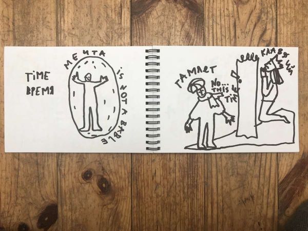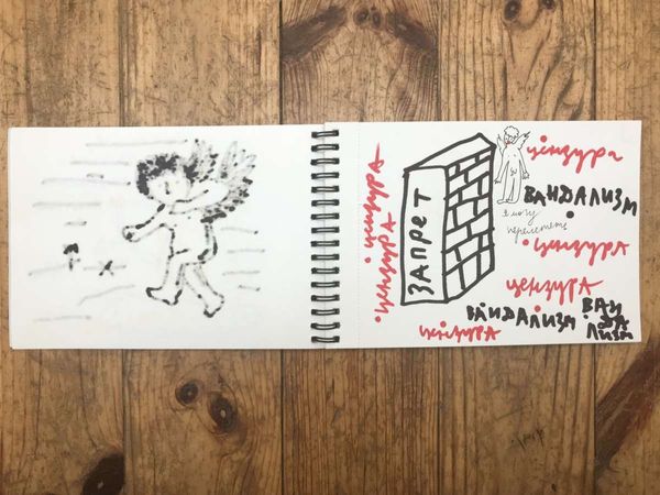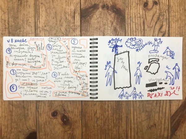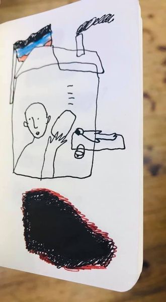 This untitled artwork by Alevtyna Kakhidze is likely from a sketchbook, using simple lines and a limited palette of black, red, and blue to create a deeply personal visual language. It’s amazing how the act of artmaking itself becomes a form of thinking and feeling. The physicality of the medium is so immediate here - you can almost feel the pen scratching across the paper. Look at the contrast between the delicate, almost tentative lines of the angels on the left and the bold, assertive strokes that define the box and figures on the right. It's like a visual representation of different emotional states. I love how the red figures seem to be both contained by and escaping from the box, with those little map like pieces. Kakhidze's work reminds me a little of artists like Joseph Beuys, who also used simple materials and direct gestures to convey complex ideas about society, politics, and the human condition. Art invites us to embrace ambiguity, to find our own meanings and connections, rather than searching for definitive answers.