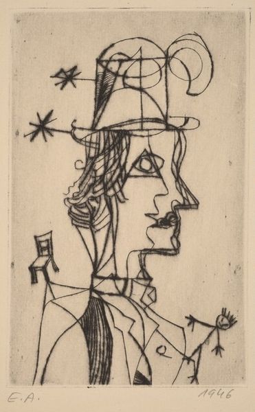 Curator: This compelling ink drawing is simply titled “Untitled,” created around 1945 by Jackson Pollock. It's a really striking piece, especially in how the stark black lines contrast with the yellowed paper. What's your initial impression? Editor: It feels raw, unsettling. Those piercing eyes, the fragmented figures… it's almost like a psychic battlefield rendered in ink. What about you? Curator: Well, seeing it, I think about the specific inks and papers Pollock would've had access to at the time. Paper shortages, variations in ink quality - these mundane constraints certainly shaped the immediacy and expressive qualities we see. Editor: Absolutely. And let's also consider the socio-political climate. World War II had just ended, and trauma and alienation were pervasive. This drawing, with its distorted figures and sense of unease, seems to me to mirror that post-war anxiety. Is there an argument for its political urgency as a silent scream for help? Curator: That’s insightful. And speaking of immediacy, observe the sheer force evident in the application of ink to paper. Consider his physical interaction with the materials; it really comes alive in the finished drawing, doesn’t it? There is such energy transferred. Editor: Indeed. This energy translates visually as defiance; a furious dance between chaos and control, isn’t it? One that certainly challenged mid-century American social constructs. This reminds me how female abstract expressionists were received. Curator: Good point. Looking closer, you can see evidence of different types of pens used as the line weights vary a good deal. But in regard to your question of how political the image can be read – it is possible his techniques or access was governed by restrictions of that time and social discourse? Editor: Of course, even the artistic tools are laden with meaning when filtered through the times that produced it. It would be absurd to not consider this as we study Abstract Expressionism, especially. Curator: I agree. Well, considering this untitled drawing through the lenses of materiality and societal impacts certainly casts new light on Pollock's practice. Editor: It highlights, really, the ways art becomes a vessel for both the individual and collective anxieties of a particular historical moment. And by understanding its cultural and political underpinnings, we have gained a deeper, more nuanced understanding of it, I hope.