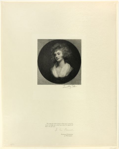 Curator: Ah, the Countess of Oxford, an etching by Timothy Cole. Probably done somewhere between 1898 and 1902, from his "Old English Masters" series. Editor: It feels so...fragile. That delicate line work makes her look like she might just float away, all wistful gazes and soft shadows. A daydream caught on paper. Curator: Exactly. Cole was an American wood engraver, celebrated for his reproductions of Old Master paintings. This series in particular aimed to make those works accessible. Reproductions became instruments of democracy in visual culture. Editor: Interesting. But here, away from the grand scale and color of paint, there's a vulnerability. Like looking at a faded photograph, you know? You almost want to know her story. What was she thinking? Curator: Portraits, especially of aristocracy, often served very specific social functions, broadcasting power, status, dynastic continuity. Editor: Well, you strip all that away in black and white. Sure, the pearl necklace whispers “wealth,” but the gaze speaks louder. It feels far more human, less like a symbol. More about interiority, and the feeling behind social appearance. I imagine it like poetry--a rendering beyond what already is. Curator: Though Cole sought precision in reproducing paintings, the very nature of translation, of switching medium, introduces… subjectivity. The etching needle’s mark is different than a brushstroke. Plus the original is lost! Editor: Lost to time, but now living in these beautiful, intentional lines, the image of a person remains. Does that mean it is also part Cole himself now? In this little work we perceive this Countess of Oxford--and Cole himself. Curator: Ultimately, a print like this one offered a glimpse into a world that many viewers in the early 20th century could only dream of accessing. And now we look and appreciate both Cole and his anonymous Countess of Oxford. Editor: Absolutely. Thank you both. The experience changed the space, if only within our inner imaginings, and now something once ephemeral is timeless once again.
