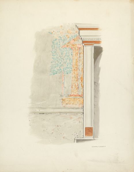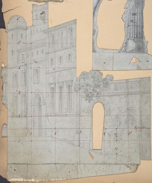 Curator: Here we have Eugène Cicéri's "Design for a Stage Set at the Opéra, Paris," created sometime between 1830 and 1890. The artwork, housed here at the Metropolitan Museum of Art, showcases the artist's talent with watercolor and colored pencil. Editor: Well, the initial impact is undeniably monumental. There’s a real sense of scale evoked by these imposing, shadowed columns, even in this relatively small sketch. The somber tones and perspective create an almost oppressive atmosphere. Curator: The use of watercolor and colored pencil gives us insight into the preparation of large scale scenic backdrops and perhaps the ephemeral and collaborative process behind stage design of the period. It’s intriguing to think about the artisans translating these initial concepts into full scale sets, and to ponder the class implications behind theatrical work. Editor: Agreed, the materiality here is striking. Look closely at how the watercolor bleeds into the pencil, creating these subtle gradations of light and shadow. It lends an incredible weight and tactility to otherwise flat surfaces. It’s almost sculptural. And how about the bold structural underdrawing - do you think the underlying gridwork might provide visual cues, as though revealing an unfinished state? Curator: Perhaps that exposed process suggests the sketch was created rapidly, indicative of high theatrical production demands, yet simultaneously emphasizing a preliminary design's significance within collaborative projects. Did these visible underpinnings democratize, or did they dictate hierarchies among workshop artists who contributed labor in various aspects—painting skills versus calculations and designs—? Editor: Hmm, there’s a tension there, absolutely, but to my eye that incompleteness brings to the fore the relationship of line to form. Notice the careful delineation of the columns’ fluting, versus the almost blocky abstraction of the architecture. A great many ideas and intentions come together into something compelling. Curator: The finished scenery would, however, conceal such underpinnings. So let's consider the cultural ramifications of that hidden labor. How might an awareness of these background forces impact the production or reception among contemporary audiences, whether wealthy elite or more working-class patrons, given Paris' cultural dynamism? Editor: Interesting points to consider! Ultimately, this piece holds such structural dynamism - in the interplay of color and perspective to which any eye will immediately be drawn. Curator: For me, the economic relationships embodied in this artwork echo beyond aesthetic considerations alone. Editor: Absolutely, and isn't it fantastic when these divergent points of view meet? Thank you.