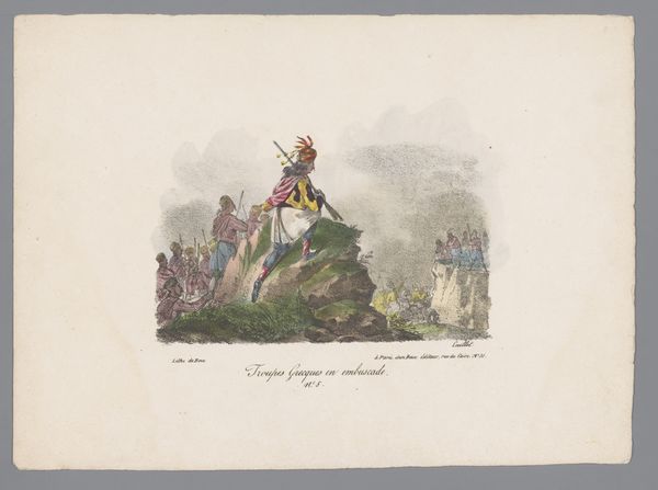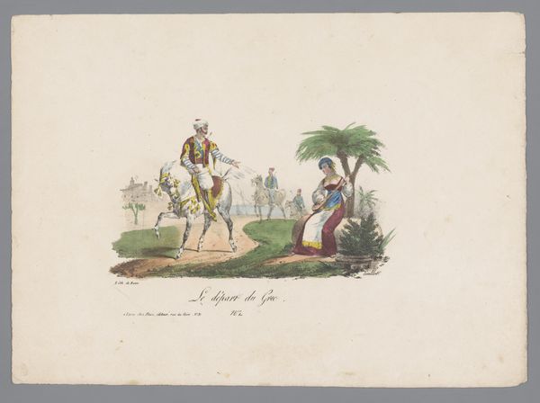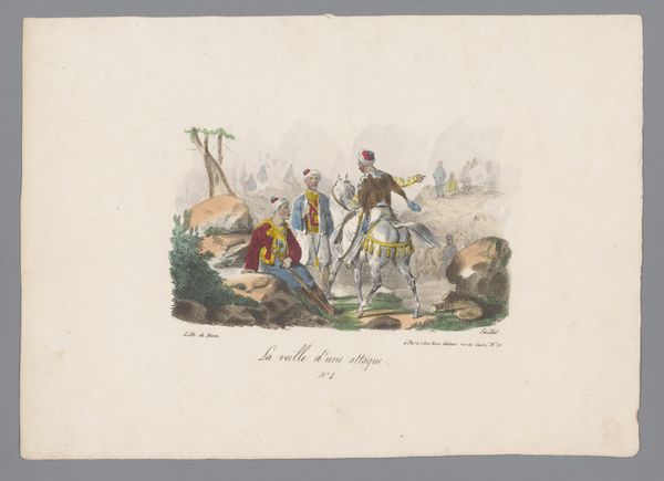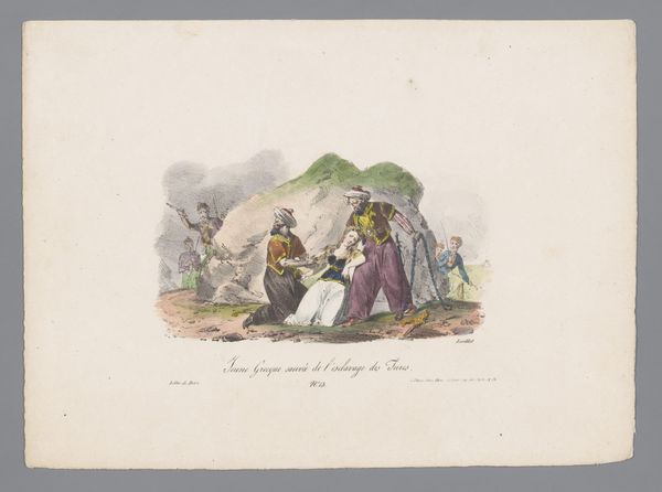 Curator: We're looking at "Revenge of a Greek Family," a print created between 1829 and 1835 by Karl Loeillot-Hartwig. It combines ink, watercolor, and what looks like colored pencil on paper. What strikes you first about it? Art Historian: It’s charged with tension. The color palette is bright, almost festive, but the scene depicts imminent violence. There’s a dramatic push and pull, figures frozen mid-action against a stark backdrop, evoking classical narratives of retribution. Curator: The lithographic process would have allowed for relatively quick reproduction, making it accessible to a broader audience during a period of intense Philhellenism. Think about the implications – how does mass production shape perceptions of distant conflicts? Art Historian: Mass production also standardized the imagery. We see the Turkish leader on horseback, rendered with certain exoticizing details that fit within established orientalist tropes. Notice the power dynamic visually reinforced here. The Greek family appears cornered. Curator: Exactly. Consider also the economics: who was commissioning and consuming these prints? What role did these images play in fueling support – both financial and ideological – for the Greek cause? Art Historian: The raised rifle, the desperate expressions... These aren't simply details. The rifle symbolizes immediate threat but also Greek resistance. The family’s emotional vulnerability pulls on the viewer's heartstrings, creating a stark contrast with the seemingly unconcerned Turkish figure on horseback. Curator: I agree. And I'd also consider the materiality of the piece. The deliberate use of watercolor softens what might otherwise be a brutal depiction, rendering it palatable for a domestic audience, safely distanced from the harsh realities of war. Art Historian: In that softness lies another layer of interpretation. Romanticizing warfare transforms bloodshed into digestible drama, stripping it of some of its most unsettling truths while bolstering its emotional resonance. Curator: Fascinating how a single image embodies such complexity! Examining its creation, circulation, and the cultural moment really allows us to unravel so much. Art Historian: Indeed. Reflecting on the imagery and its potent symbolism opens up deeper understandings of cultural memory and conflict.