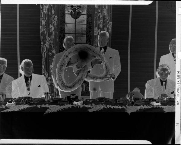 Editor: Here we see a photograph by Ken Whitmire Associates, simply titled "man and woman dining at table." The negative image creates a ghostly, theatrical feel. What stands out to you? Curator: Notice the table setting: the glassware, the silverware, the very *stuff* of a specific class and social ritual. It hints at the labor involved in maintaining this scene, the hands that arranged it. Editor: So, you're thinking about the socio-economic context suggested by the photograph? Curator: Precisely. Consider the material culture on display—the trappings of leisure and its reliance on systems of production, labor, and ultimately, consumption. Are we meant to admire or critique?