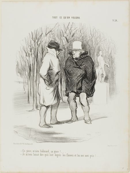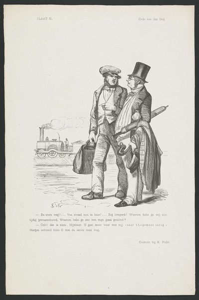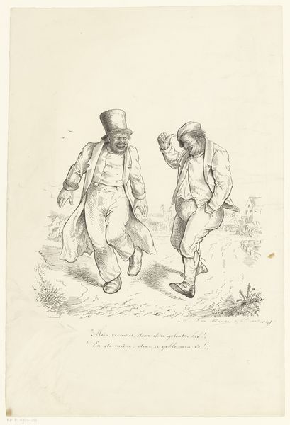 This lithograph, made by Jeremias Adriaan Adolf Schill, captures a seemingly simple act of taking off a hat as a form of greeting. Yet, this gesture is laden with social significance. The doffing of a hat in this context is a symbol of respect and acknowledgment. It's a ritualized behavior, rooted in the aristocratic traditions of bowing, where the removal of headgear indicates humility and deference. Think of similar displays throughout history: medieval knights removing their helmets to show their faces and intentions, or even religious customs that dictate head coverings. This act of greeting is a performance that has evolved, passed down through generations, shifting in meaning yet remaining fundamentally about social hierarchies and etiquette. The collective memory associated with it carries a powerful force, engaging viewers on a subconscious level with societal conventions. It embodies the non-linear, cyclical progression of symbols, resurfacing and evolving across historical contexts.