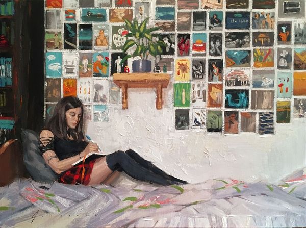 Editor: This oil painting is titled "Diana – New York City" by Vincent Giarrano, and it strikes me with its focus on the everyday. There's something intimate about capturing such a personal space. What do you notice, especially thinking about the social elements involved in its production? Curator: It's interesting you mention intimacy. From a materialist perspective, I'm immediately drawn to the labor involved, not just in the artist’s application of oil paint – that's an artisanal skill with its own history of apprenticeship and cultural value – but also consider the scene itself: the clothes, the laptop, the posters on the wall. Editor: You’re right! I didn’t really think of the posters. Curator: Each poster, each technological object like the laptop, implies a vast network of production, distribution, and consumption. And who benefits? How do those factors shape our understanding? We often see portraiture through a lens of individual identity, but where’s the global context? Editor: That’s a good question. Could the seemingly careless placement of objects and cheap décor hint at a commentary on consumerism? Perhaps even reflect anxieties around labor or lack thereof for the sitter and, maybe more broadly, within our culture? Curator: Precisely! Think about the material qualities of the oil paint itself—pigments sourced globally, linseed oil processed for its binding properties. It's easy to forget art production requires extracting resources from a far larger system than first imagined. Even “genre painting” as we might superficially categorize it, reinforces pre-existing socio-economic structures. Where’s our starting point for the material examination? Editor: I’ve never thought of it that way! It's amazing how focusing on the materials and the production side of things opens up a whole new layer of understanding about a seemingly simple painting. Thanks for making me look closely. Curator: Likewise! Looking at it through a new perspective adds unexpected insights.
