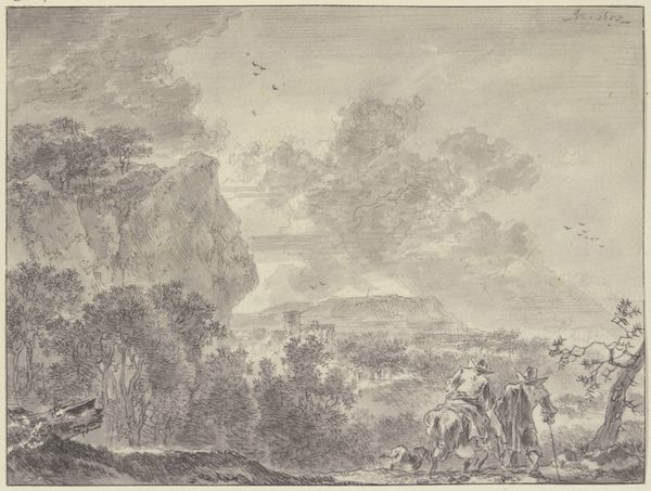 Curator: There's a captivating energy in this work; it feels almost theatrical. The interplay of light and shadow gives it a dramatic flair, wouldn't you agree? Editor: Absolutely. The stark lines and contrast amplify the vulnerability and uncertainty of the travelers. Looking at "Boomrijk landschap met gewapende mannen," a Dutch Golden Age etching by Pieter de Molijn from circa 1620 to 1630, I immediately sense a world in flux, where landscapes become both a refuge and a stage for human dramas. Curator: And there is something deeply rooted in our collective memory about these landscapes, something primal. Note how the density of the trees evokes both promise and danger. The figures, mere silhouettes, journey through what could be a path to enlightenment, or towards darkness. Editor: Exactly, and placing this piece in its historical context is important. Consider the socio-political environment of the Dutch Golden Age, with its wars and its expanding mercantile networks. The armed figures might symbolize the anxieties and opportunities associated with territorial disputes and the projection of power, not just overseas, but even at home. Curator: They seem to suggest not just historical war but something psychological, some aspect of our own defenses as we approach life's journey. These landscapes were more than mere scenery. Artists infused them with layers of meaning, mirroring human ambition, spiritual yearning, and social tension. It's like reading a map of the soul. Editor: Well said! Molijn manages to capture the nuances of the epoch, its visual politics, and the nascent construction of national identity through nature and narratives. This etching becomes more than just a picturesque image, it becomes a lens to understand the emergence of a nation through artistry. Curator: In a sense, this tiny etching contains entire worlds and their unfulfilled desires. Editor: Yes, and each carefully considered mark carries so much historical weight. It’s amazing.