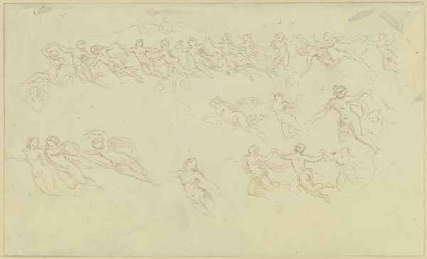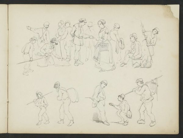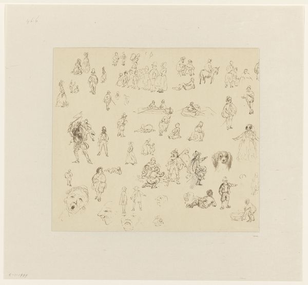 Curator: This delicate pencil drawing by Adrianus Eversen, titled "Figuren in verschillende houdingen," or Figures in Various Poses, offers a fleeting glimpse into 19th-century life. What’s your immediate response to it? Editor: It feels ephemeral, like a half-remembered dream. The barely-there lines suggest a crowd, but without strong definition, they almost melt into the paper. Is this meant to capture a fleeting moment? Curator: Exactly. It reads like a study or sketch for a larger, perhaps unrealized, genre painting. These sketches often functioned as a repository of ideas, figures, and compositions that artists could draw upon later. The figures, rendered with a simple pencil on paper, point toward the Romantic movement, and offer a window into a simpler past. Editor: Simpler for whom? I find myself looking for cues about their social standing. There’s a casualness to the grouping that is evocative, yet knowing their specific roles or relationships in society is lost. Are they simply ‘figures’, abstracted away from the nuances of the class and cultural positions that inform interactions in that time? Curator: Interesting point. Eversen's use of the pencil, with its inherent qualities of softness and transience, adds to a certain anonymity, yes. These archetypes are relatable through the ages because they portray the collective societal values of family and community. Editor: Perhaps. Or it might be intentionally obscuring something else. Erasure is powerful, too, in its historical implications. By presenting these people without specifics, does Eversen deflect or even undermine our expectations around the display of status? I can see how their lack of distinction becomes a mirror, then, where one generation recognizes another. Curator: You see a reflection of contemporary anxieties, maybe a commentary. For me, the drawing transcends those specifics. It speaks to our shared human experiences across time, and reveals underlying, immutable conditions. That, I believe, is its power. Editor: A provocative reminder to seek not just continuity but also transformation in these traces.