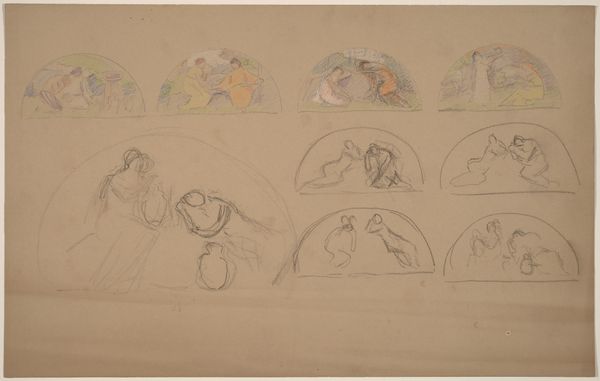 Charles Sprague Pearce made these watercolor studies for lunettes on paper. Here we see his early concepts for a series of semi-circular paintings, likely intended for a public building or institution. Pearce was an American expatriate painter working in France during the late 19th century. The sketches depict allegorical scenes of everyday life: marriage, religion, labor, the arts. Each scene is carefully composed, with figures arranged in classical poses within the shallow, stage-like space. We might ask ourselves, what vision of modern life is Pearce trying to convey here? Is he reflecting on the progressive social movements that shaped the period? Or is he celebrating more traditional values? To fully understand Pearce's aims, we would want to investigate the social and cultural context in which he was working: the history of mural painting in France, the role of art academies, and the political debates surrounding public art. Only then can we understand the true meaning of these studies and their place in the history of art.