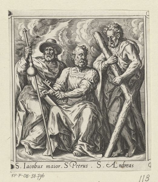 This engraving shows three saints—Matthias, Paul, and Simon—each holding an object associated with their martyrdom, rendered by an anonymous hand. Consider Paul, in the center, who grasps a sword. In early Christian iconography, the sword is the quintessential attribute of Paul, referring to his execution by beheading. Yet the sword's history stretches far earlier, to the Bronze Age, when it symbolized power and authority. The Greeks saw it as both a tool of war and a sacred object. In Paul's hand, the sword represents divine justice, a motif echoing through centuries of art. Think of Michelangelo’s *Last Judgement*, where angels wield swords. The sword is a constant, yet its meaning shifts, evolving with cultural memory. It embodies humanity's complex dance with power, sacrifice, and transformation, reflecting the enduring influence of these archetypes on the human psyche. The past is never truly gone; it resurfaces, transformed, in our present.