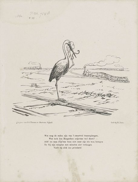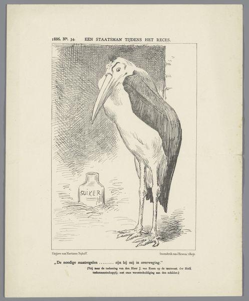 Editor: This drawing, "Ooievaar tussen kikkers," or "Stork Among Frogs," by Patricq Kroon, dating from sometime between 1900 and 1935, uses pencil and what appears to be aged paper. I'm struck by the cartoonish feel, the stark lines creating an almost satirical atmosphere. What do you make of it? Curator: It’s fascinating to consider the drawing as a material artifact, isn't it? The aged paper itself tells a story of production and consumption of resources within a particular historical period. Look closely at the artist's choices. Why drawing rather than painting, with readily-available pigment? And why this specific paper quality? Consider the paper shortages that accompanied both world wars and its impacts. The use of pencil suggests both immediacy and perhaps, economic constraints. Editor: That’s interesting. I hadn't really considered the materiality beyond just… the image. The artist titled the work: “The Hague Conference, The Quackers.” It feels very pointed now. Curator: Exactly. Knowing that shifts our focus. Kroon uses simple materials – paper and pencil – to address political themes, likely commenting on diplomatic gatherings in The Hague. Could “Quackers” reference idle chatter, ineffectual politicians posturing like a hungry stork and passive, fearful frogs? This rendering uses labor – both Kroon's physical act of drawing and the social ‘labor’ it portrays – to make a sharp political commentary. Notice the way that mass culture and politics get entwined in Kroon's work and also that he questions boundaries between high and low art, between the 'serious' work of statecraft and the seemingly trivial medium of political cartoons. Editor: So it's about elevating the ordinary materials and making us reflect about a serious message. Thank you for enlightening me to see its satirical tone! Curator: Indeed! By paying attention to the material conditions, it enhances our ability to really examine what we're seeing. It's rewarding to consider all factors involved in its creation and reception.