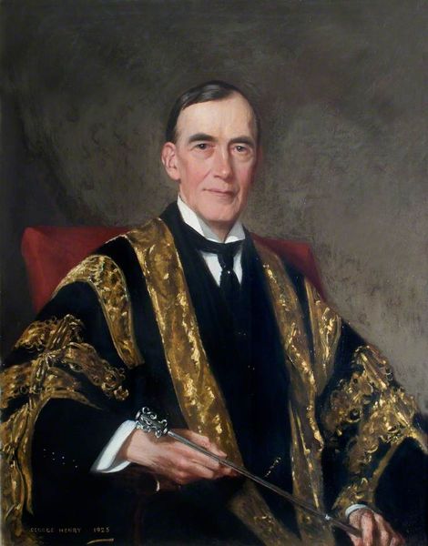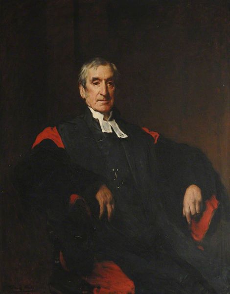 Editor: Here we have William Logsdail’s portrait of "The Reverend Alfred Nathaniel Holden Curzon," painted in 1909. It feels very formal, a little austere even. The sitter appears calm, composed... what do you make of this portrait? Curator: Formality certainly plays a key role. Notice how the subdued palette directs our gaze primarily toward the Reverend's face, but then travels down toward the hand clasping what seems to be a walking stick. His bearing projects respectability and a quiet authority; does that suggest anything to you? What emotional connections might viewers have had to representations of the clergy during this period? Editor: Perhaps a sense of moral guidance, or a figure of stability in a changing world? The symbolism is subtle, isn’t it? Not overt religious imagery. Curator: Precisely! This isn’t overt hagiography. The symbols here are societal markers; his clothing, the setting, his composed demeanor all suggest status and belonging within a specific cultural framework. He’s carefully constructed, and what would it have meant to curate your own public image through portraiture like this? How does this compare to images that we see in today's media, and in what ways are those images curated as well? Editor: That's a fascinating point – it's image management from over a century ago. So, in looking at it as an icon, it's not about religious symbolism in a literal sense, but social symbolism? Curator: Yes, absolutely! Logsdail uses realism to convey more than just a likeness. He offers us access into a network of signs pointing toward social standing and power dynamics within Edwardian society, but also ideas surrounding legacy, faith and continuity. It is so potent! Editor: I’ve definitely learned to see how portraits communicate a lot more than just a face. There's an entire symbolic language to decode!