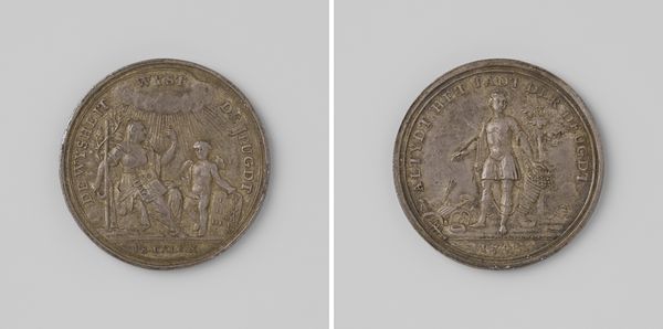 Curator: This object, dating from 1683, is a medal called “Ontzet van Wenen, ter ere van Johan Georg III, keurvorst van Saksen." It commemorates the Relief of Vienna, honoring Johan Georg III, Elector of Saxony. Editor: It looks serious, almost grim, doesn’t it? The metal feels cold and the figures are all about strength and conquest...heavy stuff. Curator: It's baroque, a style known for its grandeur. Let’s unpack some context. The medal was created to celebrate the victory over the Ottoman Empire at the Battle of Vienna. Understanding this shifts our perspective, right? It embodies themes of power and the defense of Christendom. Editor: Right, I see it now! Suddenly the stern-faced portrait makes sense, this isn't just some guy; it's Mars, Saxon version, gazing into the battle, with that bonkers helmet. But wow, the other side. A total victory goddess stamping on what I assume are fallen foes! Little harsh. Curator: These medals served as potent symbols of political and military power. It was designed as a symbolic communication tool to emphasize triumph. Notice the Latin inscriptions too? Editor: I did! A little Latin never hurt anyone. It gives it an air of authority, like an official seal of, "we kicked butt." It's quite a powerful message condensed in such a small, portable object. You could wear your victory around. How very decadent. Curator: It also makes one reflect on whose stories get amplified. While it immortalizes one version of heroism and celebrates Christian triumph, the narrative of the defeated, and the suffering caused, often remains obscured in artifacts like these. Editor: That’s it. This cold little disc is screaming a very one-sided story, isn't it? Now I am starting to feel a little conflicted. Curator: These objects force us to engage critically with dominant narratives and question what stories get told and whose get suppressed. The medal gives us a chance to remember the broader context. Editor: Makes you think. The shine’s gone for me now. A beautiful, terrifying little document of history’s rough edges.