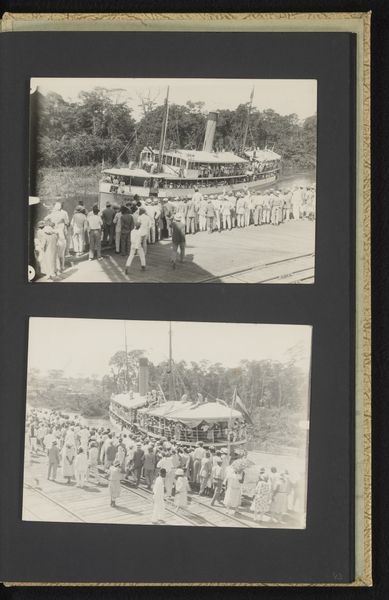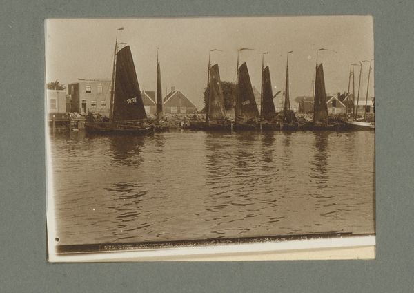 Curator: Looking at this gelatin silver print by W. de Ringh, dating between 1885 and 1922, entitled “View of a Quay with a Paddle Steamer in Sneek”, my immediate feeling is that of capturing a frozen moment in time. Everything feels still and calm even if it depicts what seems to be an event in town. What do you see? Editor: Yes, it feels quite static despite the many figures gathered along the waterfront! What strikes me is the layering of national symbols - the Dutch flag snapping on one boat, the decorations draped overhead. It feels carefully stage-managed, a constructed image of national pride. Curator: It certainly highlights the power of imagery. The photograph shows the relationship between local communities and broader national identity being forged in that time period. The steamboats are obviously new technologies arriving and creating spectacles but that is tied very consciously into expressing Dutchness. Editor: Absolutely. Waterways have always held immense significance in the Netherlands – a connection to trade, travel, and defense. The paddle steamer becomes an extension of that symbol. Note the crowds, mostly men, gathered – are they observers, participants, stakeholders in this unfolding narrative? What narratives were pushed forward at this type of events, I wonder. Curator: Well, that steamboat might not just be about technology but the development of national identity and tourism as an industry during that period. Photographs like these certainly fed that machine to promote this romantic version of a hyper-local destination that connects directly to the history of the Dutch nation-state. The way history becomes staged and sold. Editor: I see your point – the image promotes both technological advancement and deeply rooted traditions. Even the somewhat muted tones of the gelatin silver print itself contribute to a sense of historical weight and legitimacy. As if saying "this happened, this matters." Curator: The decision to present Sneek this way contributes to shaping regional Dutch identity. But you see those socio-political relationships even in genre pieces like this. I’m thinking of the patronage, production, the selection itself of what ends up represented this way for an audience. All elements come into play. Editor: Indeed. By understanding the image's composition, and the cultural context of 19th and early 20th century Netherlands, we're able to dig deeper into its layered meanings and uncover the power of what may seem like just a pleasant historical townscape. Curator: I agree, exploring the symbolism alongside the social framework unveils how it actively crafted regional and national pride in its own day – a kind of controlled collective memory.