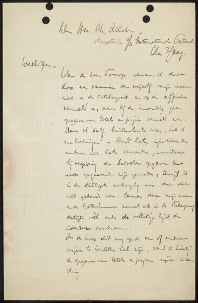 Curator: This "Brief aan Philip Zilcken" by Jan Toorop, possibly from the early 1900s, is interesting, especially when we consider the material history of such correspondence. Editor: It's just a letter, rendered in ink. What is there to discover? Curator: Precisely! It's tempting to see it solely for its informational content, but what if we consider the socio-economic context of its creation and reception? This isn't a typed memo. It’s handwriting with specific materials, wasn’t it? Editor: Right, pen and ink. What does that tell us? Curator: Think about the production of ink and paper at the time. Where would Toorop acquire these materials? How might their cost or availability have impacted the letter's creation? Also, what does the act of handwriting itself—the labor involved—tell us about the relationship between Toorop and Zilcken? Was this a task done out of intimacy? Editor: That is definitely true, especially because typing could have reduced the amount of time required to compose the letter. Curator: Indeed! And consider the role of postal systems at the time. How did this letter travel, and what labor was involved in its delivery? Letters are cultural goods and its interesting to study their method and creation to unveil a message. Editor: It does change the way I see it. Before, I just saw the information, and how it communicated that, but I can see that there is so much that lies in the materiality of the work and the historical processes behind the final object. Curator: Exactly! It opens a door to understanding not just the message, but the entire network of social and material relations in which Toorop was operating.