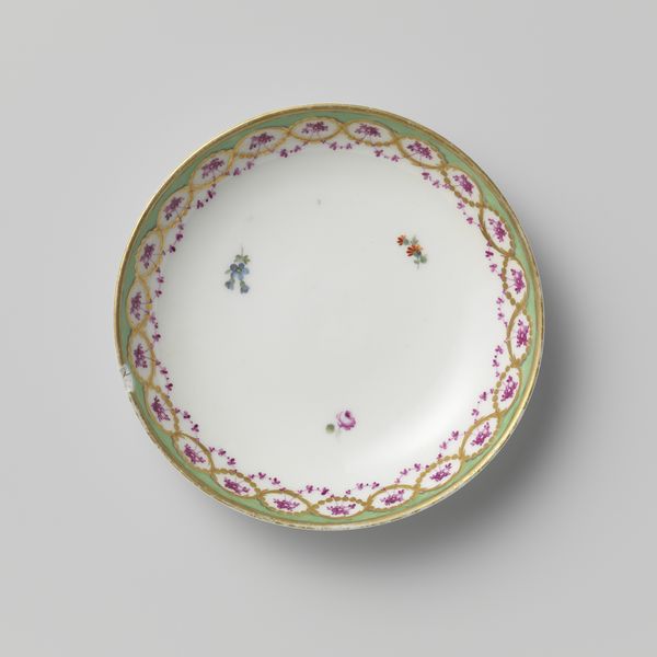 This plate was painted in Loosdrecht, Netherlands, at an unknown date. It is decorated with an ornamental border, from which hangs a garland of leaves and a bouquet of flowers. This refined object reflects the cultural and economic vibrancy of the Netherlands. Loosdrecht, known for its porcelain factories, became a hub for decorative arts. Its style embodied luxury, appealing to wealthy merchants and aristocrats. Porcelain production was not merely about craft; it was tied to trade, social status, and the competitive spirit of the time. The emphasis on delicate floral motifs mirrors a broader European fascination with the natural world and its decorative potential. Historians delve into period documents, trade records, and artistic trends to unveil the layers of meaning embedded in such artifacts. Understanding the context allows us to appreciate how art objects like this plate were entangled with social and institutional forces.