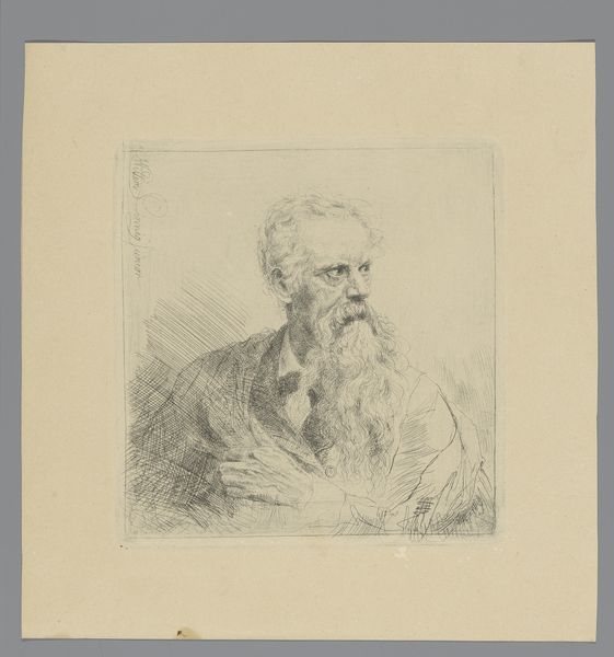 Ingeborg Andréasen-Lindborg made this etching, Portræt af Sigurd Müller, presumably in Denmark. It's an intimate portrait; the kind of drawing you make when you're really looking, patiently watching a person in front of you. The drawing is delicate, with fine lines hatching across the surface, giving a sense of volume to Müller's face and beard. Look at the way Andréasen-Lindborg uses line to describe the contours of his face, especially around the eye and the cheekbone. There's a real tenderness in the way she captures his features. The hand that props up his face is lightly rendered, as though barely there, or even as if the sitter is holding up the weight of time. The print reminds me of other portraitists like Whistler, who used etching to capture a sense of atmosphere and character. Ultimately, like all good art, this little portrait leaves room for questions, inviting us to bring our own experiences to the encounter.
