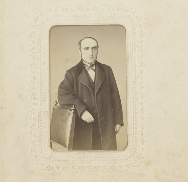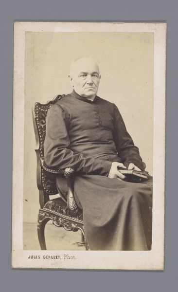 Curator: This print, created sometime between 1835 and 1886, presents us with a compelling “Portret van pater J. Frentrop.” Editor: The somber tonality strikes me immediately. A constrained palette seems fitting for the subject’s contemplative demeanor. Curator: Indeed. As a historical object, the print offers insights into the role of religious figures in 19th-century society and how they were represented. The sitter, Pater Frentrop, is positioned within an interior that includes books and a crucifix; the objects speak to the setting of scholarly pursuits and spiritual dedication. Editor: And notice the way the light falls, almost exclusively, upon Frentrop's face and hands—drawing the viewer’s eye and inviting closer inspection of his expression and the book he is holding. The artist is making clear semiotic choices here. Curator: Considering it’s a print, there are interesting questions surrounding its production and circulation. Was it intended for a wide audience or for a more intimate circle? What was the public role of pater J. Frentrop and did this affect the dissemination of his image? Editor: One also considers the stark, almost photographic realism captured here, while recognizing the labor-intensive process of printmaking. A tension emerges when comparing it with the rapid rise of photography during this period. This challenges us to contemplate the role of print as a rapidly changing mode of portraiture. Curator: Certainly. While it emulates realism, the hand-worked nature is still crucial, perhaps lending an aura absent from mechanized image making. It would be interesting to determine whether this was created using lithography, etching, or another printmaking process of the period. The subtle details seem rendered by an artisan highly trained in his field. Editor: Ultimately, the effectiveness of this portrait lies in the interplay between light and shadow, directing us not just to the visual details but suggesting an introspective quality, a visual depiction of spiritual dedication. Curator: A truly fascinating piece offering many opportunities for social, cultural, and political analysis—something to which we should return for closer scrutiny soon. Editor: Agreed. There are clearly layers embedded within this work that call us back to engage in its intricacies.