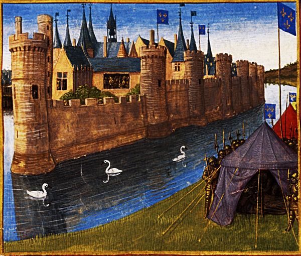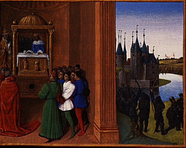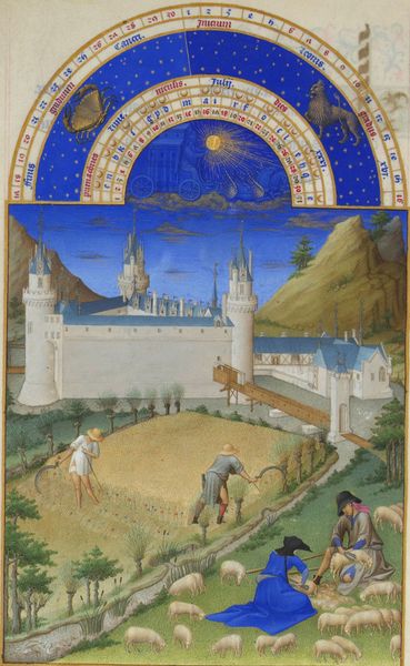Editor: Here we have "Death of William Longsword," painted around 1460 by Jean Fouquet. It’s tempera on parchment, a miniature from a manuscript, I believe. I'm struck by how the serene, almost fairytale landscape contrasts with the grim event taking place in the foreground. How do you read this juxtaposition? Curator: It's interesting you pick up on that tension. It’s as if Fouquet is setting the stage for a tragedy, making the scene feel both monumental and deeply personal, don't you think? I mean, look at how precisely each element is rendered, yet there's a dreamlike quality to the light. It's as if the entire world is bearing witness to a single, terrible moment. Does that make sense? Editor: Absolutely! It's like he's creating a kind of historical stage set, where the personal drama of the characters is played out against this grand, indifferent backdrop. It makes me wonder what the location is intended to represent, any thoughts? Curator: Ah, now you're diving deeper! This is more than just scenic backdrop. The architectural details, like the imposing castle, echo the political powers at play. I think Fouquet uses the landscape and architectural elements to reinforce the weight of history. Editor: That’s a good point! So the castle and idyllic setting almost underscore the cold, calculated nature of William's assassination? I initially saw a visual dichotomy, but now I get a sense of Fouquet's trying to show something about history's grand narrative versus the stark reality for individuals caught within it. It’s a world where momentous historical events are both inevitable and ruthlessly intimate. Thank you for your insight!