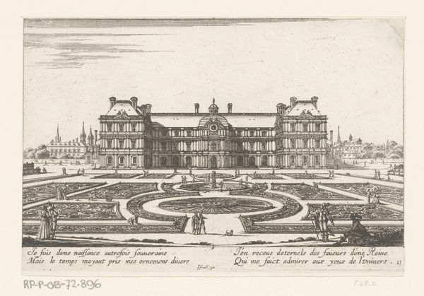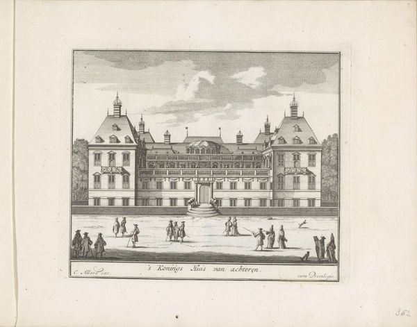 Curator: Here we have an engraving titled “Paleis Honselaarsdijk van achteren gezien,” or "Honselaarsdijk Palace Seen From the Back," dating from around 1696 to 1774, attributed to Cornelis Danckerts II, housed right here at the Rijksmuseum. Editor: My first thought is symmetry, an almost chillingly perfect balance. It’s architectural, but it almost feels more like a stage set. Look at those figures; are they walking, waiting, or posing? The light seems flat, somehow. Curator: Baroque architecture prized symmetry, yes, reflecting order and divine harmony, not necessarily stagecraft, but this could be staged for the monarchy. Notice how the architectural elements like the balconies, windows and even the rooftop decorations mimic each other on both sides of the central axis. This emphasis can act as visual mnemonics, reinforcing social structures. Editor: It's undeniably skillful, but what's going on at ground level interests me more. Look at the figures. Engraving demanded incredible precision. Can we know if this was commissioned by someone at the Palace? How were the materials sourced? What about the labor involved in its making? Curator: It's believed to be from a series depicting Dutch palaces. Considering its timeframe, the Palace held significant political power and wealth, these visual emblems played a powerful role. But more than just showing power, palaces such as this also reflect ideas of aspiration. A key role of symbolic display. Editor: Aspiration, perhaps, but it also locks into a system. Engravings like this replicated easily and disseminated power, one that served the Palaces interest over anything else. Where's the raw earth, the garden labor, the cost in human toil required to upkeep all this order and symmetry? That labour is abstracted away. Curator: True, this sanitized view served to solidify power structures through strategic visual omission. We see not the construction or toil, but rather a testament to the order and reason, both of this universe and to the Palace. Editor: I think this tension between grand depiction and the unseen labour makes these prints so compelling today, though. A fascinating window onto what they wanted us to see, and what they conveniently left out. Curator: Exactly! It forces us to confront what a building really signifies—whose vision it represents and who pays for its upkeep. Editor: Indeed, the symbolic resonates differently when we trace its roots back to the ground, the materials, and the making.
