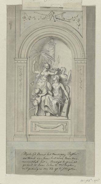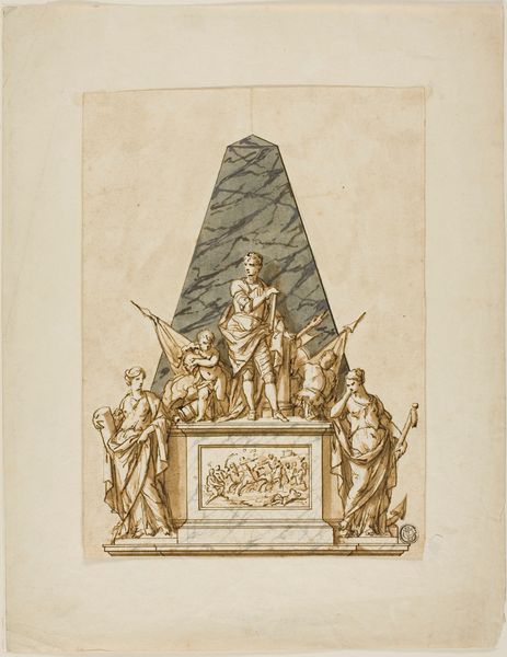Joseph Nollekens created this design for "The Three Captains Memorial" with pen and grey ink, watercolour, and graphite. The memorial presents as a constructed tableau, a layering of symbolic figures against a stark blue pyramidal backdrop. The composition employs a classical language, using allegory to convey themes of honour and remembrance. Note how the linear precision and the calculated arrangement of figures—from the reclining river god to the winged Victory—create a sense of order. The monument is structured around a clear hierarchy of forms, which may reflect the period's emphasis on reason and order. The use of watercolour allows for delicate gradations of light and shadow. This enhances the three-dimensionality of the figures, giving them a sculptural presence even on paper. The drawing does more than represent an aesthetic form, it encapsulates and questions the period's values and aesthetic ideals.