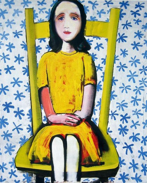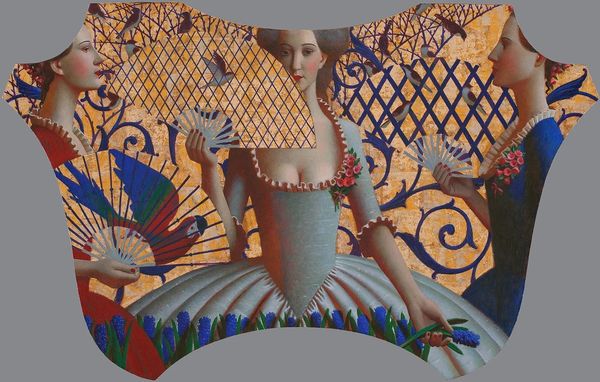 Sofia Bonati painted "Emilia" using watercolor. Watercolor, a mixture of pigment and binder suspended in water, has been used for centuries, but is often seen as craft, rather than fine art. Here, Bonati employs the material to create a patterned composition. The nature of watercolor lends itself to layering and blending, which allows for a smooth, luminous effect, evident in the woman's skin and her clothing. The details of the background filled with leaves, berries, and abstract shapes, highlight the delicate and controlled application of the paint, which invites viewers to explore the level of detail imbued in the surface. The making of this artwork feels intentionally meticulous and repetitive. Looking closely, you’ll see each individual mark combines to create an enchanting effect. This level of care suggests that Bonati engaged in her creative process by taking the time to carefully build up layers of colors and patterns, showcasing the value of working by hand. This piece challenges the traditional hierarchy that positions fine art above other forms of creative labor.
