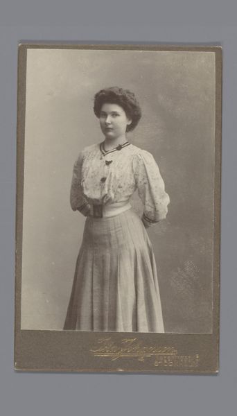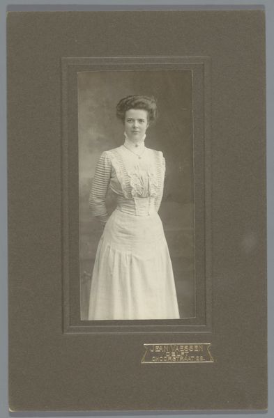Editor: This is a photograph titled "Portret van een onbekende vrouw" or "Portrait of an Unknown Woman" by Jean Vaessen, dating from about 1900 to 1920. It's currently held at the Rijksmuseum. It's captivating; I’m struck by the sitter’s quiet gaze and the formality of the pose, especially knowing it was taken so long ago. What do you see when you look at it? Curator: It's fascinating how such a seemingly straightforward portrait can open up discussions about the social constructs of identity and representation at the turn of the century. Photographs like these became increasingly accessible to the middle class. They were about documenting and projecting a certain ideal – in this case, a demure, respectable femininity. Does the fact it is labelled "unknown woman" affect your reading? Editor: It does. If it were someone recognizable, famous even, the image would be completely different. Knowing she's unknown makes me think about the countless unrecorded lives, especially of women, in that era. What was the purpose of taking photos for non-elite people, like her? Curator: Photography was gaining popularity and helped solidify social status. These portraits, taken in studios, were not just personal mementos; they became tools for self-presentation and participation in visual culture. Family albums were incredibly important. Did this sitter's attire – the high-necked dress, the hairstyle with the ribbon – signify adherence to social norms, do you think? Editor: I see your point. It’s almost like performing the role of womanhood expected by society at the time. The photographic framing and its presentation enhance that. Curator: Precisely! Consider also how the photographer, Vaessen, played a role. This wasn’t just a passive recording. It’s a constructed image, shaped by societal expectations and the studio's aesthetic. Understanding this reveals how photography, even back then, was deeply intertwined with the performance of identity. Editor: That changes how I see the piece. Now I realize there is a conversation that opens with the cultural norms of womanhood from that time in history. Curator: Absolutely, and considering these nuances adds depth to our appreciation, transforming it from a simple portrait into a powerful lens through which to examine social history.