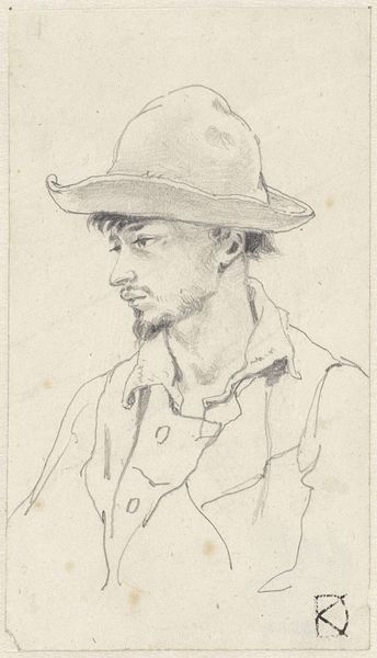 Editor: Here we have Johan Daniël Koelman's "Studie van een man met een hoed op en een jas over zijn schouder," dating from about 1841 to 1857. It’s a pencil drawing, seemingly a study for a larger work, perhaps. I am struck by its unfinished nature. What are your thoughts about this sketch? Curator: This pencil drawing presents a compelling insight into artistic production. The visible process, the deliberate mark-making with pencil on paper, disrupts any illusion of seamless representation. Instead, we are confronted with the labor inherent in art creation. Editor: Labor? Can you elaborate? Curator: Certainly. Consider the time, the hand movements, and even the source of the graphite used for the pencil itself. The paper's provenance matters, too; was it handmade, what were the labour conditions of the mill workers that made this paper? These are all material aspects directly connected to social and economic contexts. Editor: That's a very different way of looking at a simple drawing. Curator: Exactly. Instead of just focusing on aesthetics or the subject's identity, a materialist approach digs into the systems that enabled the artwork's creation. How might the rise of industrial pencil production influenced artistic practice during Koelman's time? How the social status or occupation affected its representation in portraiture? Editor: It sounds like you're seeing more than just a sketch; you're seeing a whole network of connections. It makes me consider how the simplest art can embed so many layers. Curator: Precisely. By engaging with the material reality of art, we open avenues for understanding its relationship to society and its intricate webs of production and consumption.