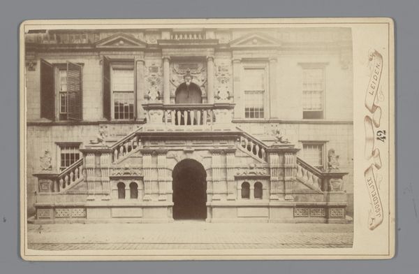 Editor: This albumen print, titled "Gezicht op een universiteitsgebouw in Genève," was taken sometime between 1880 and 1920 by A & P. Noblet. There’s a remarkable stillness to this photograph; a monumental symmetry defines the architectural facade. What structural elements stand out to you? Curator: The formal composition is undeniable. The bilateral symmetry anchors the visual field, drawing the eye directly to the center, and the grid-like placement of windows lends a sense of order and control. Consider the shadows; how do they articulate the three-dimensionality of the building? Editor: They add a layer of depth, preventing the image from appearing flat, but the tone seems almost uniformly pale. Curator: Indeed. The limited tonal range reinforces the emphasis on form rather than dramatic light play. The meticulous rendering of the architectural details further highlights the artist's preoccupation with precise representation. Have you considered the geometry? Editor: Yes, the interplay of vertical and horizontal lines is extremely prominent. I noticed the balance between the curves of the arched windows and the rigid, straight lines of the building’s frame, creating a tension. Curator: Precisely. It's this tension, achieved through careful manipulation of form, that gives the image its strength. And what might be the affect? Editor: Now that you point that out, I recognize how the geometric and balanced forms provide an emotional feeling of stability and grandeur, despite the picture's still atmosphere. Thank you for helping me look at the photograph from that new viewpoint! Curator: It's in the careful observation of form that we come to appreciate the artistic intent. Thank you.
