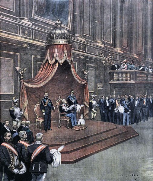 Nicolaas Pieneman captured the inauguration of King William II in the Nieuwe Kerk in Amsterdam on 28 November 1840 with oil on canvas. Observe the throne canopy, a symbol of royal authority, elevated on a dais draped in crimson. The throne's canopy evokes the baldachins found above religious relics or revered icons. The red fabric, frequently associated with sacrifice, power and royalty, is prominent in many Renaissance paintings, such as Titian’s portraits of Doges. The gesture of William II conveys a sense of duty. We see depictions of similar gestures through the ages, from Roman emperors addressing their legions, to bishops bestowing blessings. It is a visual echo through time, where the emotional resonance of authority and solemnity remains potent, touching our collective memory. These gestures are not merely ceremonial, but act as a powerful visual language engaging viewers on a deep, subconscious level. The throne, the canopy, the gestures: motifs which resurface, evolve, and take on new meanings in different historical contexts, proving history is not linear, but cyclical.