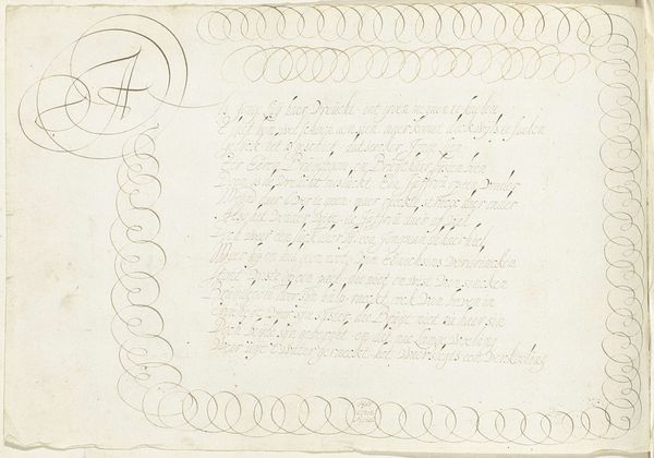 Gesina ter Borch created this drawing, "Aforisme over vriendschap", with pen in 1649. Note the pale tonality, defined by the stark contrast between the dark ink and the bleached-out paper. The eye is drawn to the handwritten text enclosed within a whirlwind of spiraling lines. These graphic loops, almost hypnotic in their repetition, dominate the composition. They create a visual tension, framing the text while simultaneously threatening to engulf it. The structural arrangement destabilizes the conventional relationship between text and image, suggesting perhaps that the essence of friendship, like these swirling lines, is less about concrete definition and more about dynamic, fluid interactions. Consider how ter Borch has used the intrinsic qualities of line and form. The swirling structure, the way it defies a singular focal point, encourages us to see meaning not as fixed but as something that evolves. Like friendship itself, this drawing invites continuous interpretation.