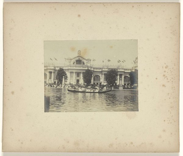 Editor: This is "Boats with Italians and Irish at the World's Fair in St. Louis," a gelatin silver print from 1904. It’s so textural; the way the light hits the water, and the way it’s faded slightly with age, creates this dreamy quality. What strikes you most about this image? Curator: Immediately, I’m drawn to the balance achieved through the symmetry of the architecture and its reflection. Observe the way the photographer manipulates the tonal range, emphasizing the contrasts within the composition. What function might the degradation of the image’s surface serve? Editor: Well, perhaps it lends a sense of historical authenticity? I also notice the soft focus. Was that intentional? Curator: Quite possibly. Pictorialism, as a movement, often embraced soft focus and other techniques to elevate photography to the status of art, moving it away from simple representation. Look closely at the forms—the geometry of the building against the organic shapes of the trees and people. It is a strategic manipulation of elements, would you agree? Editor: I see what you mean. The rigid architecture really emphasizes the impermanence of the human element. It makes you question the solidity of everything. Curator: Precisely. The arrangement generates a visual dialogue between the enduring structure and the ephemeral nature of human activity, doesn’t it? Editor: That's fascinating. I initially focused on the "dreamy quality" and missed the underlying structure and those contrasts you pointed out. Thanks! Curator: My pleasure. It’s in that interplay of surface and underlying form that we discover the richness of visual language.